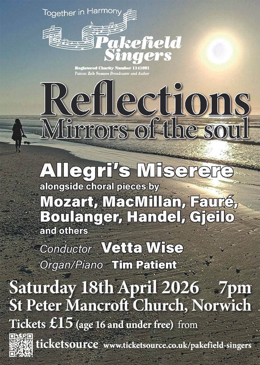 On Saturday 18th April, the Pakefield Singers returned to the Church of St Peter Mancroft to offer a challenging and conceptually rich concert: ‘Reflections: Mirrors of the Soul’. The central idea of the concert was to match together differing musical interpretations of the same words. The whole concert was structured symmetrically. This concept came to the fore when hearing the difference between the Ubi Caritas of the Taizé community and the setting composed by Ola Gjeilo. The former had been composed as meditative chant and allowed space for individual sections of the choir to offer their own distinctive contributions. the words of Gjeilo’s Ubi Caritas presented themselves as an address directed at the audience, exhorting them to strive to end conflict and division. In both cases, special praise is owed to the sopranos, who were able to soar over the music in a way that was both prominent and remarkably gentle.